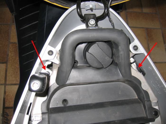 Dann müssen noch die Schrauben des Seitenteils und des Seitenschwellers (neben ded im Bild gekennzeichneten Schrauben gibt es noch jeweils zwei Befestigungsschrauben des Schwellers von unten).gelöst werden.