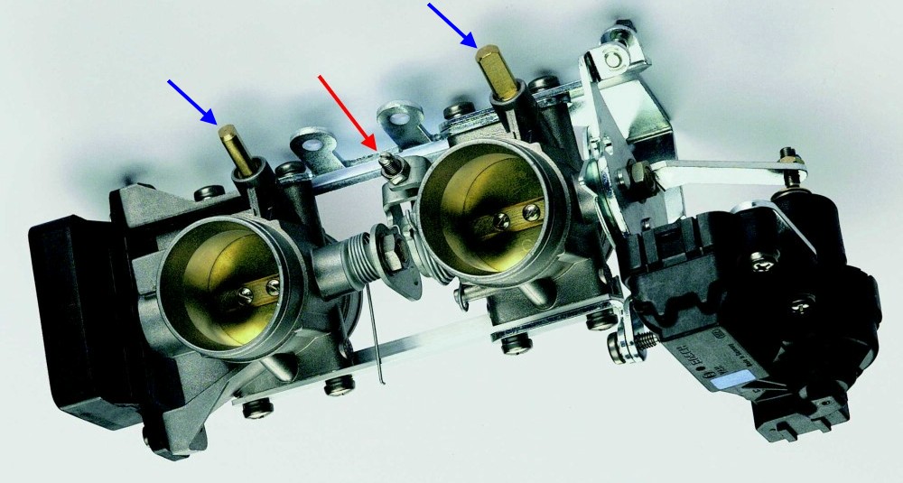 Im Gegensatz zu den anderen 4-Ventil Boxern ist jedoch an der C die Einstellung der mechanischen Kopplung der Drosselklappen im eingebauten Zustand des Drosselklappenstutzens nicht vorgesehen und auch nicht möglich - diese Einstellschrauben (roter Pfeil) der Anlage sind nicht zugänglich. Die blauen Pfeile kennzeichne die Einstellschrauben für die Nebenluftregulierung - diese ist einstellbar, mehr hierzu jedoch später.